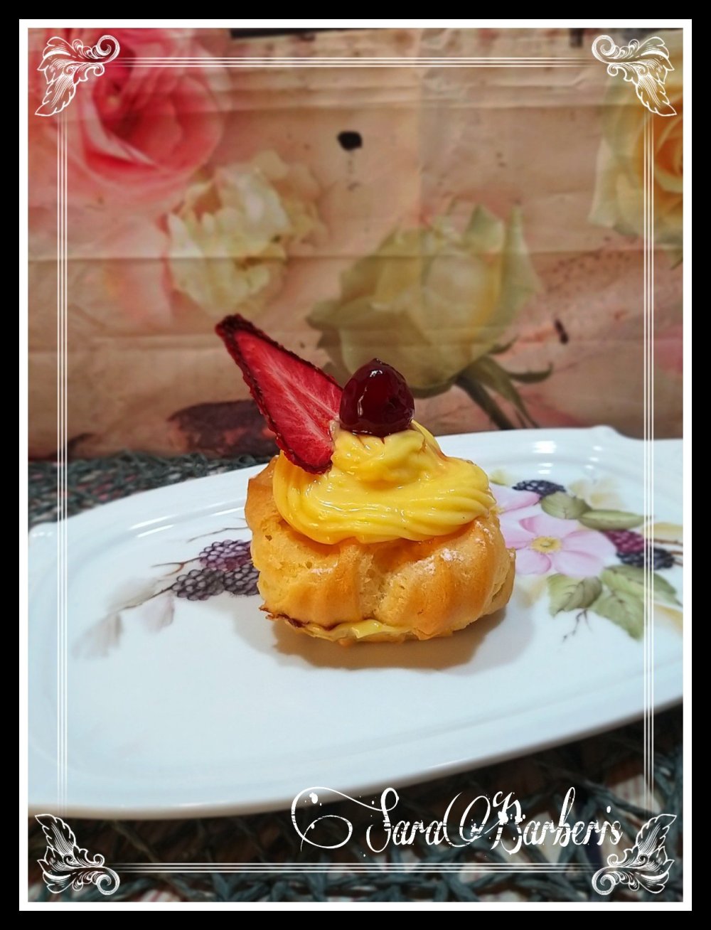 Per far felici i miei figli ho steso un velo di crema alla nocciola nella zeppole poi la crema pasticcera all’arancia. Infine ho decorato con ciuffo di pasticcera amarene candite da me e una fetta di fragola essicata.