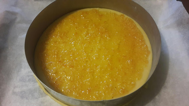 Facciamo un disco di frolla leggermente più piccolo dello stampo e spalmiamo un velo di marmellata di arance (che sposa bene col cioccolato),