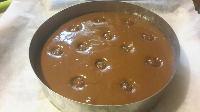versiamo l’impasto al cioccolato e mettiamo sparse delle scorze di arancia candita (io ho messo delle ciliegie sciroppate).