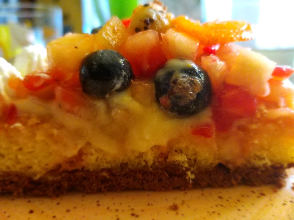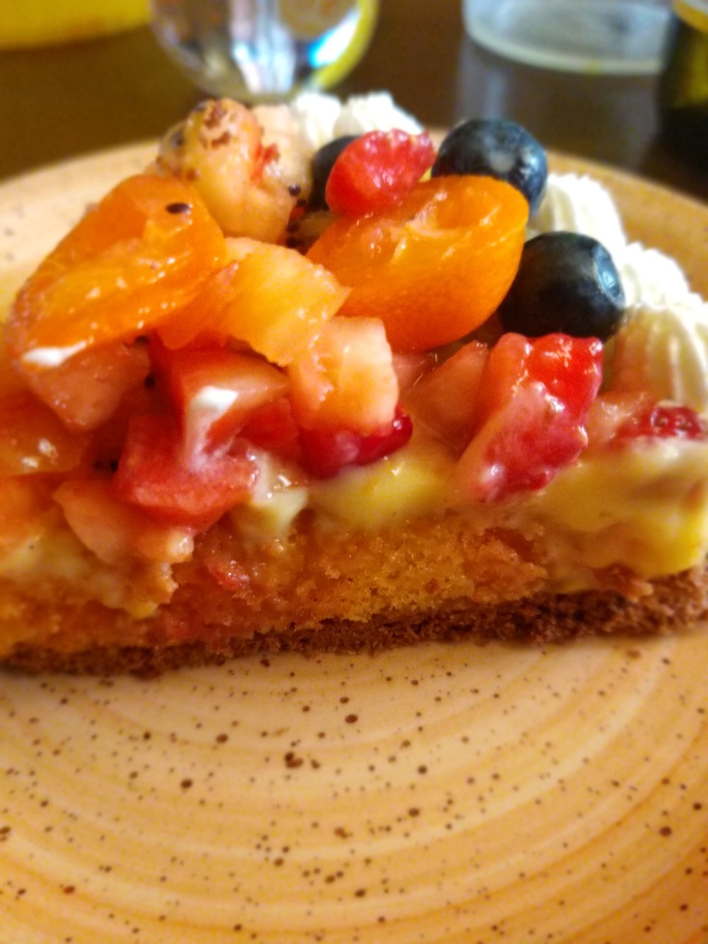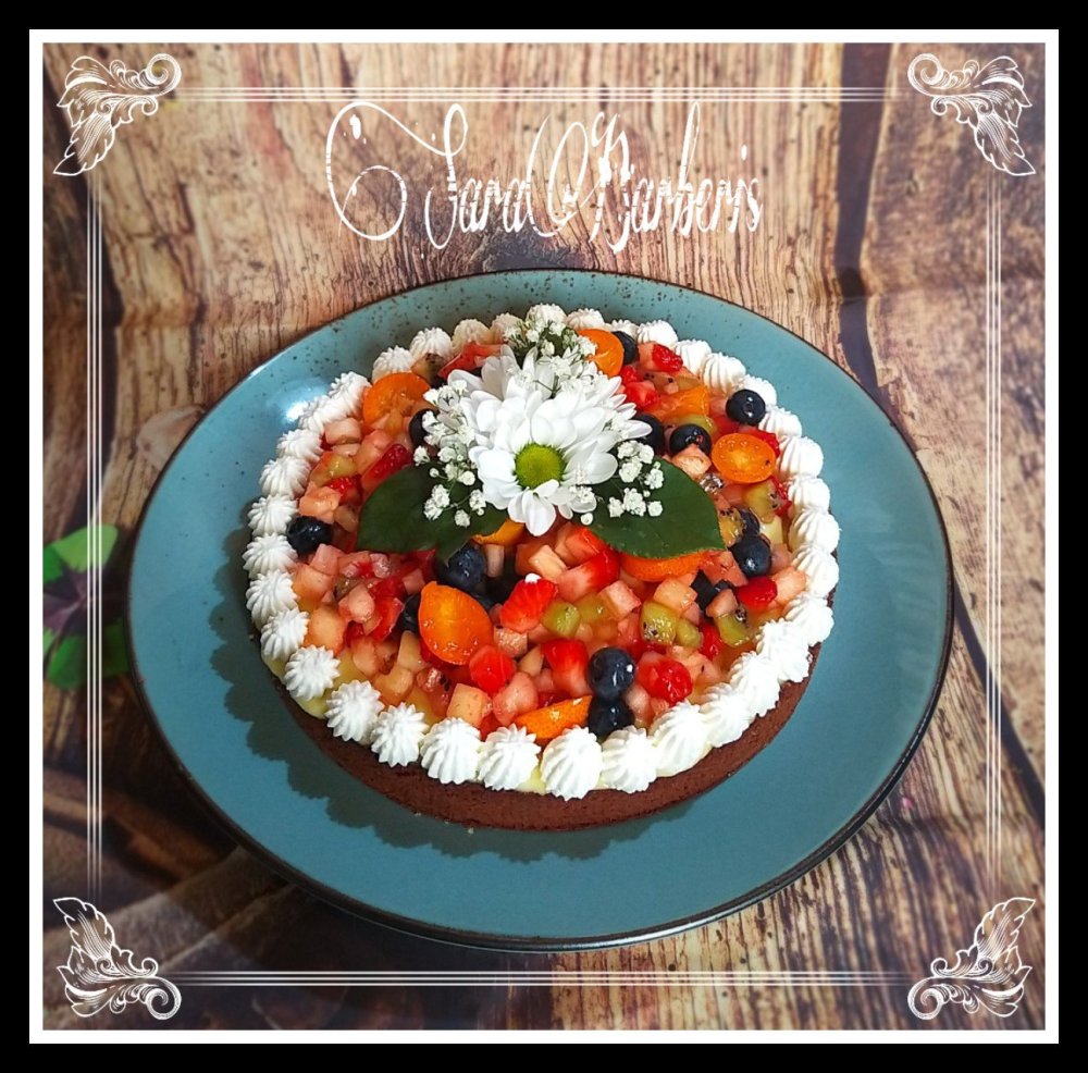 Un guscio di frolla Pan di stelle dove ho messo della purea di frutta esotica, ho tagliato a strisce il pds e l’ho messo dentro al guscio, sopra ho messo altra purea di frutta esotica e ho spalmato con la crema pasticcera, infine ho decorato con ciuffi di panna e dadolata di frutta fresca. Una torta molto molto buonaaaaa.