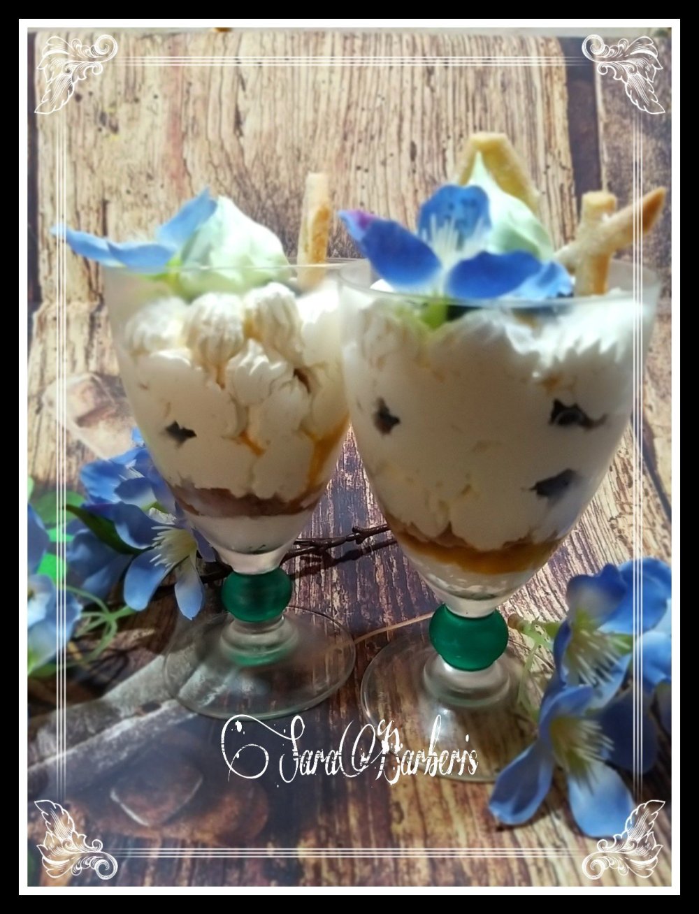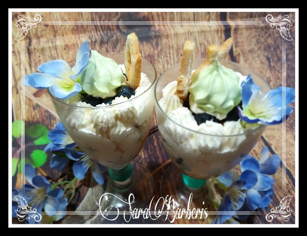 Siccome mi era avanzata della crema ho fatto anche due bicchieri con della frolla sbriciolata al cioccolato, della purea di frutta e mirtilli il tutto a strati.