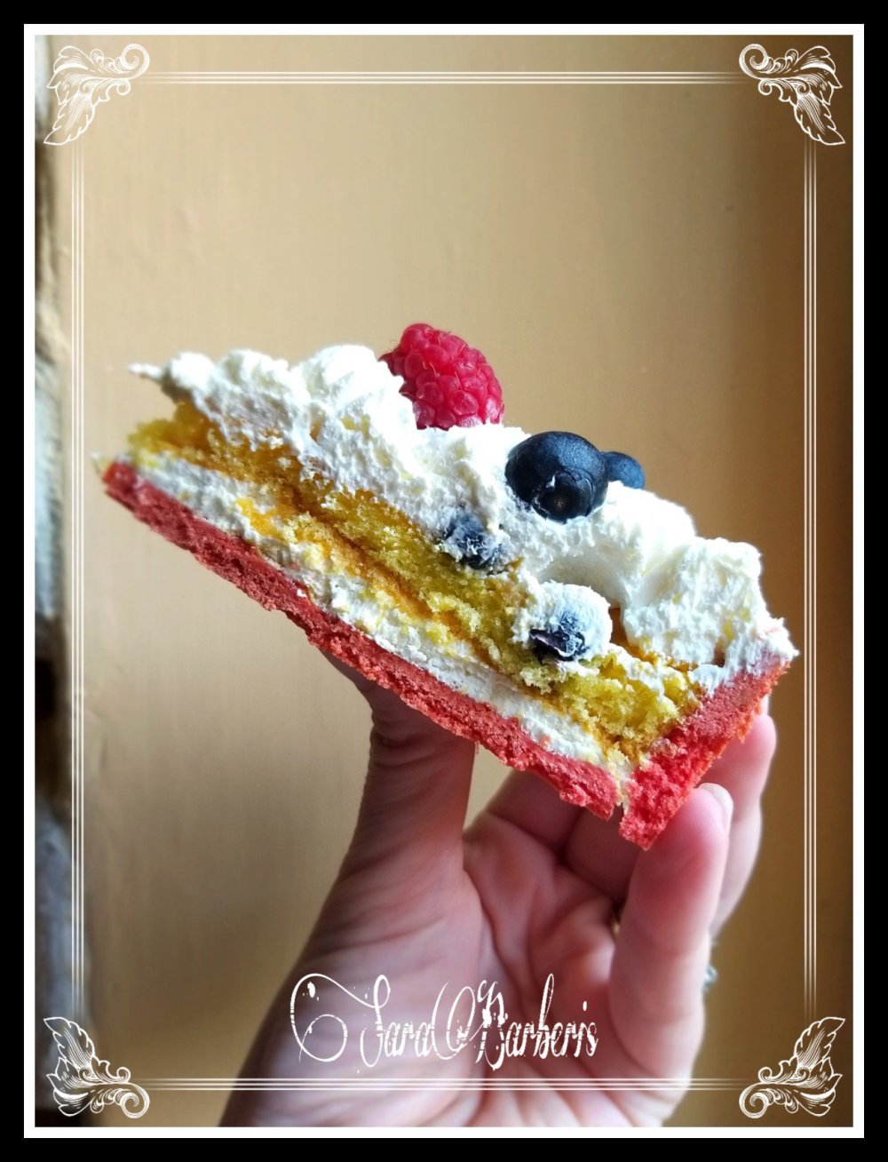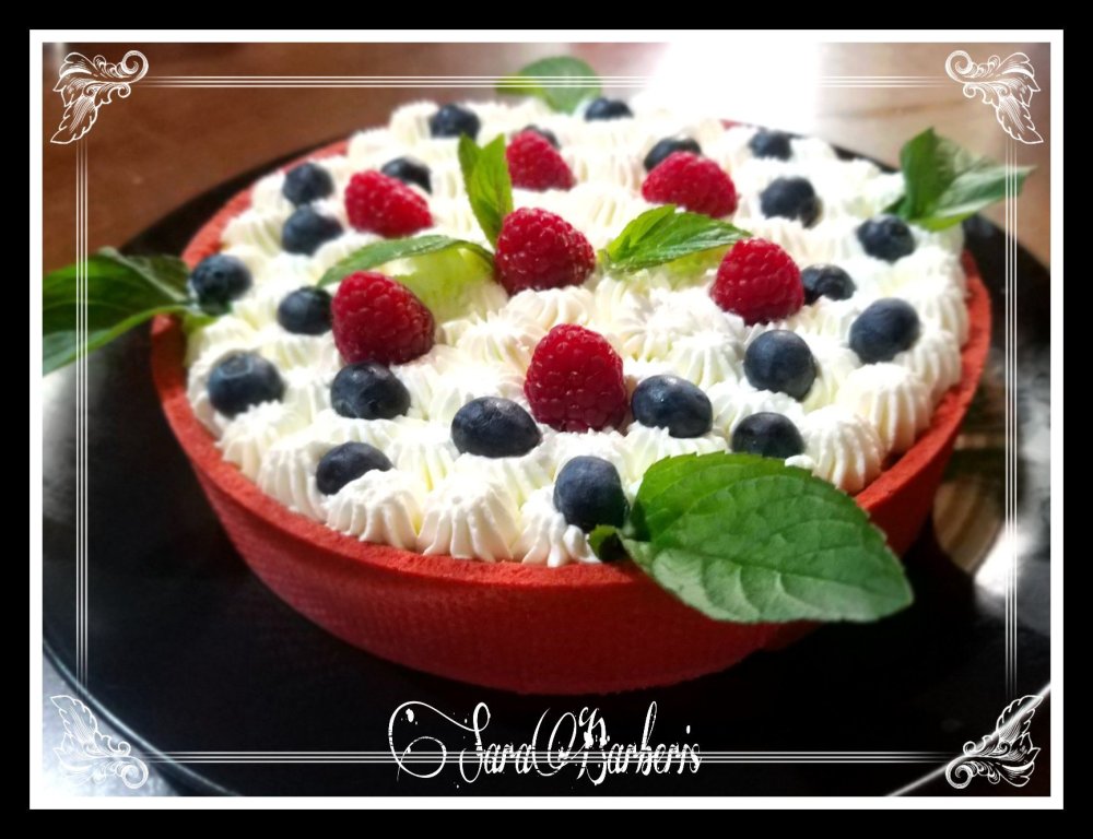 A questo punto mettere una fetta di pandispagna e bagnare con purea di frutta poi cospargere di frutta a piacere, io mirtilli e lamponi, infine fare ciuffi di crema tiramisù.