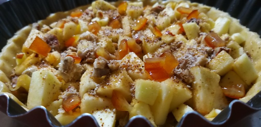 A questo punto ho steso un velo di marmellata di marroni che ho fatto qualche settimana fa. Poi ho aggiunto due mele grandi a dadini, castagne bollite senza pellicina e sbriciolate, ho spolverizzato con dello zucchero di canna, ho aggiunto delle bucce candite di arancia a dadini e una spolverata di farina di nocciole.